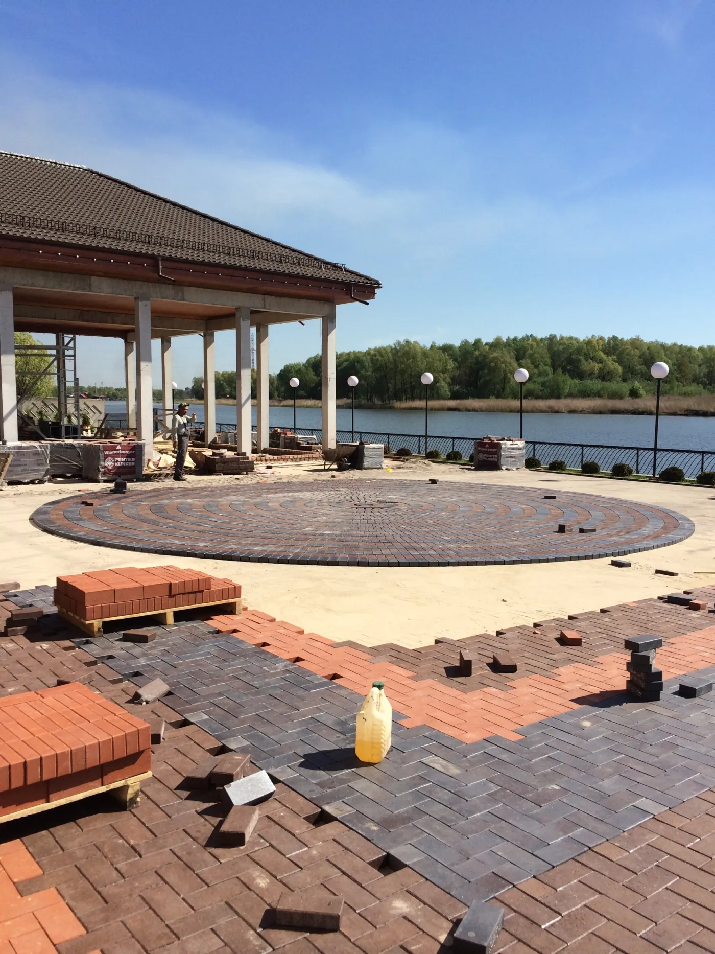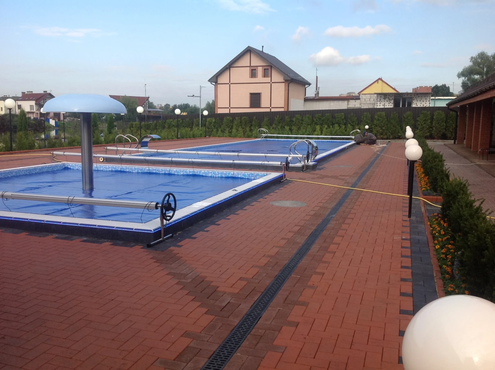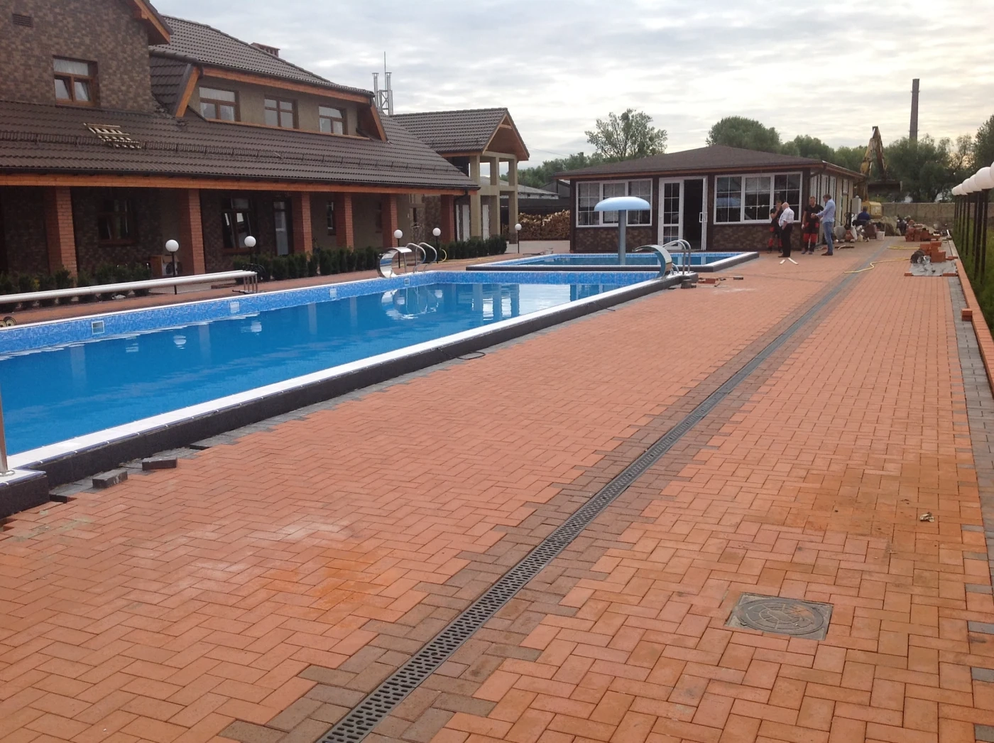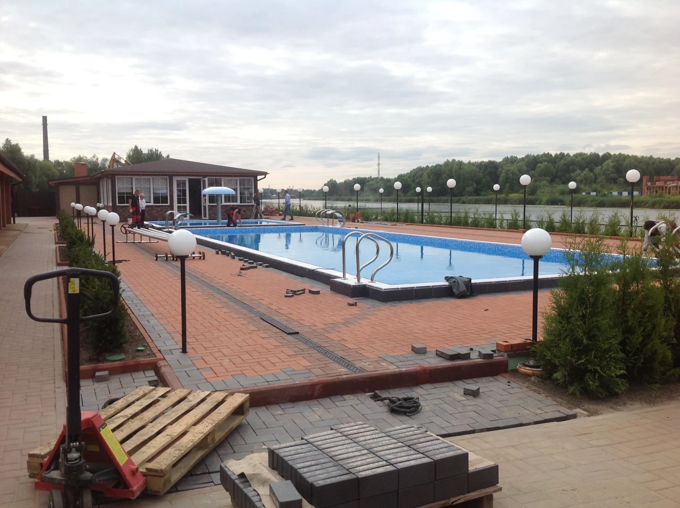Дополнительно благоустроена территория вокруг бассейнов и набережная реки Преголя. Реализованные решения обеспечивают долговечность покрытия, устойчивость к влаге и высокий уровень эстетики.