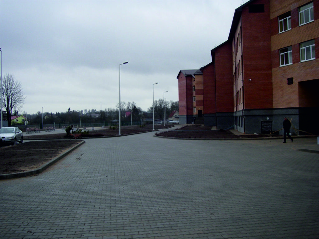 В рамках проекта проведена подготовка основания и выполнена укладка тротуарной плитки «катушка». Обустроены пешеходные зоны, парковочная территория и подъездные пути.