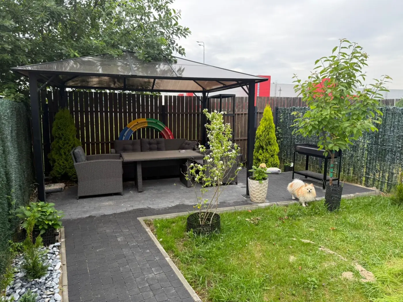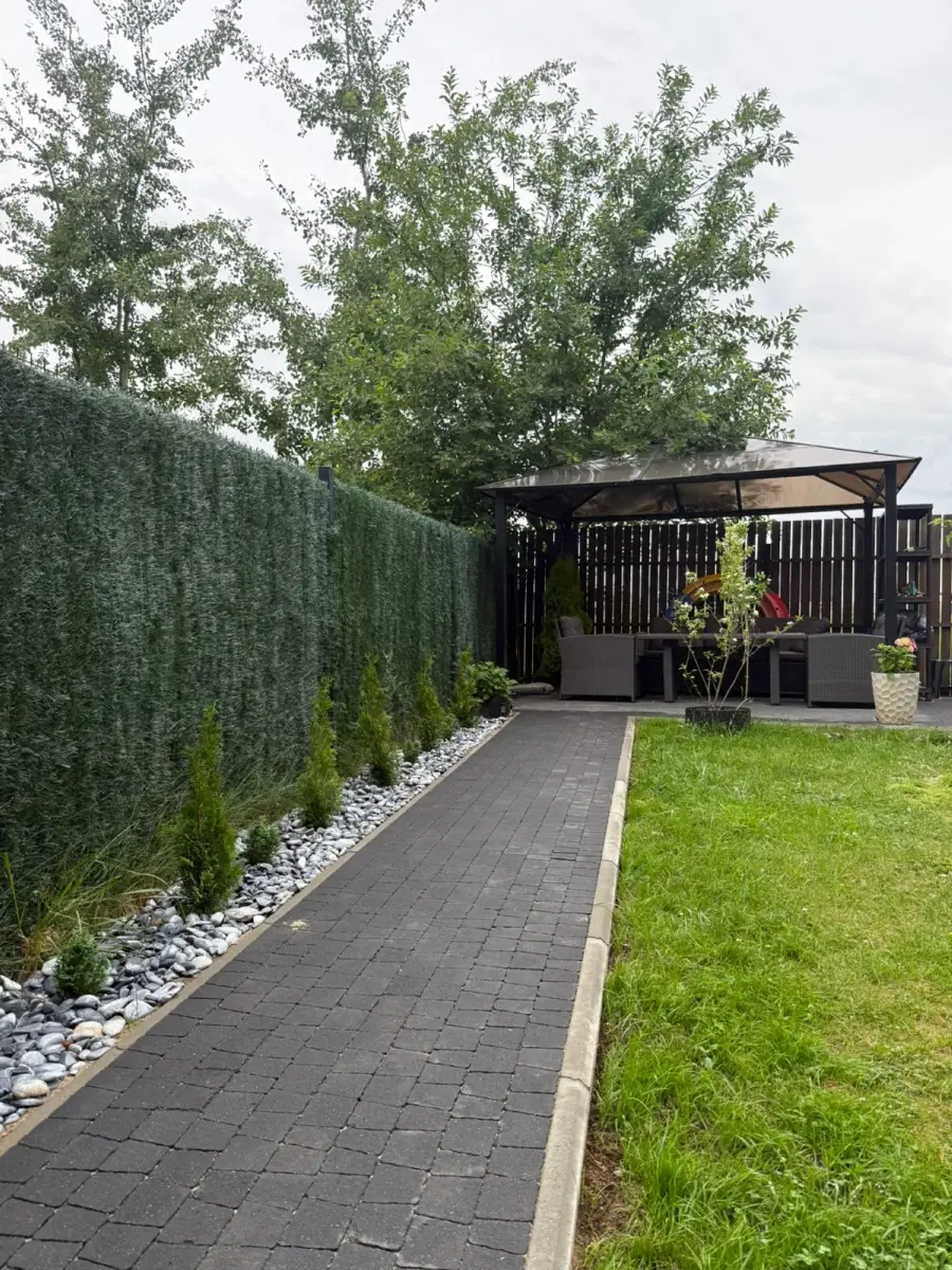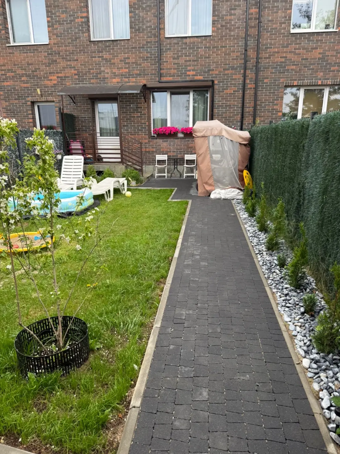 В рамках проекта проведена подготовка основания, обустроены тротуарная дорожка и территория под навесом с укладкой тротуарной плитки «Римский брук» темного цвета. Также установлены скрытые бордюры, обеспечивающие аккуратный внешний вид и четкую геометрию покрытия.