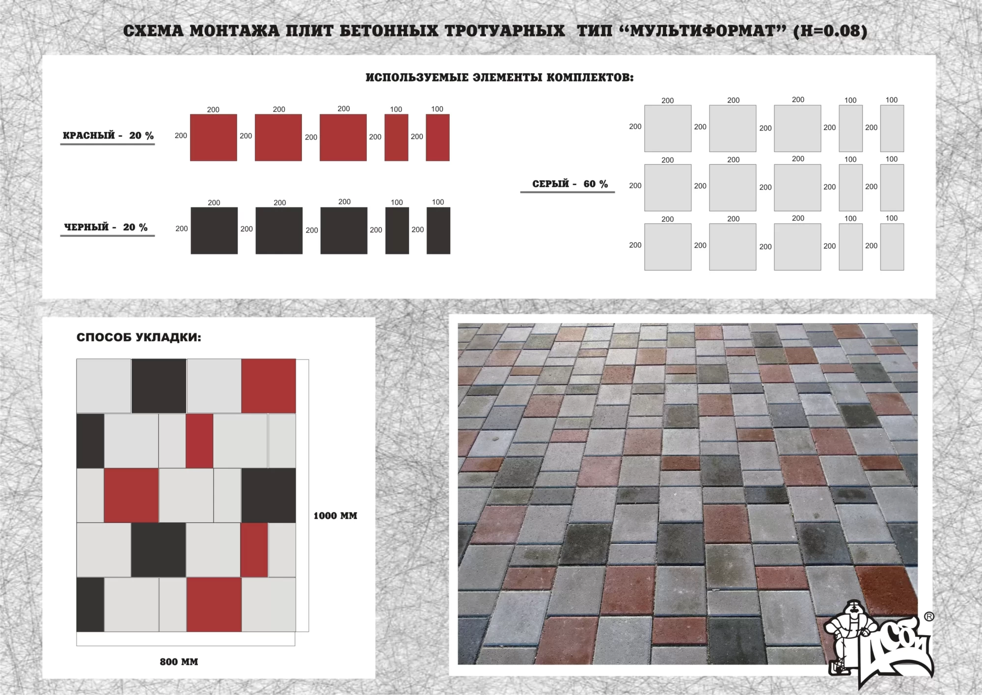 Соотношение элементов при укладке на 1 кв.м — 3 шт (200×200) и 2 шт (200×100). Поставка осуществляется комплектами.